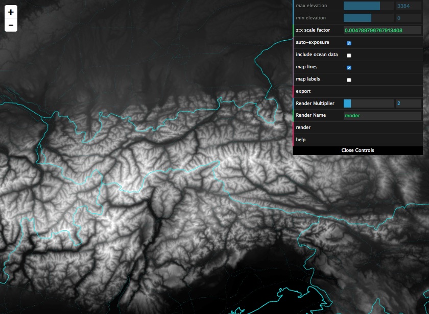 Mit der Einstellung des Dienstes "Terrain-Party" hat "Tangram" die Rolle als bekannter Vertreter der heightmapper eingenommen. Inzwischen ist Terrain-Party wieder online, im Prinzip gilt der Text auch für diesen Anbieter. Reinzoomen in die Karte, zur Orientierung vorher die "map lines und map labels" einschalten, damit die Ländergrenzen und Orte sichtbar werden. Auf rendern klicken und nach kurzer Zeit kommt die heightmap-png auf den Rechner. Wer nur die heightmaps braucht und auf Texturen verzichten kann, ist mit Tangram oder Terrain-Party gut bedient.