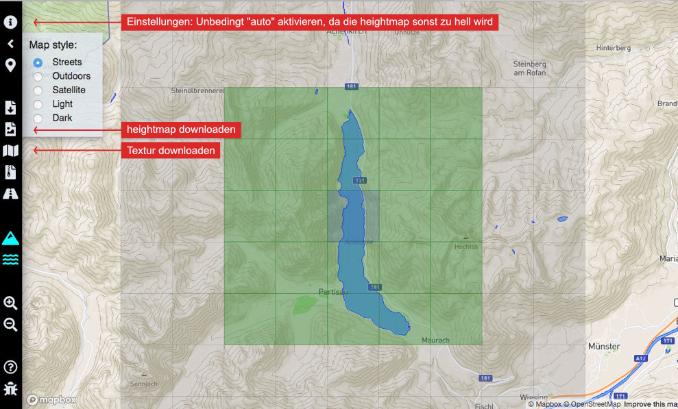 Bei den heightmap-Generatoren plus Texturen fällt "Heightmap Skydark" mit einem übersichtlichen Interface und zahlreichen Funktionen auf. Neben den heightmaps kann zwischen verschiedenen Map Styles (siehe Bild) ausgewählt werden. Auch RAW-Daten können heruntergeladen werden. Das besondere an Skydark sind die Texturen und die allgemein sehr gute Qualität der mapbox-Daten. Die Größe der Skydark-Texturen ist 2560x2560 Pixel, die heightmap ist lediglich 1081x1081. Heightmap Skydark ist in der Betaversion kostenlos (Stand 06. Mai 2023). Ob das auf Dauer so bleibt, wird sich zeigen.