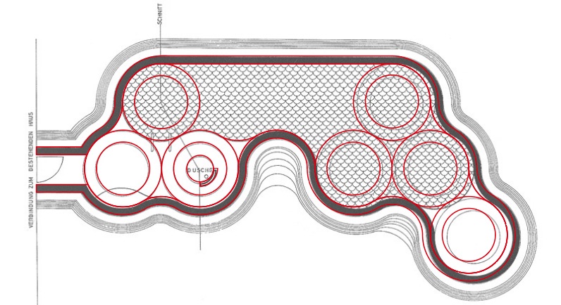 Der Eingang zum Grottenbad war an das unscheinbare Einfamilienhaus angebaut, da es um das Bad geht, hab ich es weggelassen. Das Modell selbst beruht auf Fotos und dieser Planskizze, die ich im Internet gefunden habe. Die Höhen sind, anhand von Fotos, mehr oder weniger geschätzt, mangels Plan der Seitenansicht.