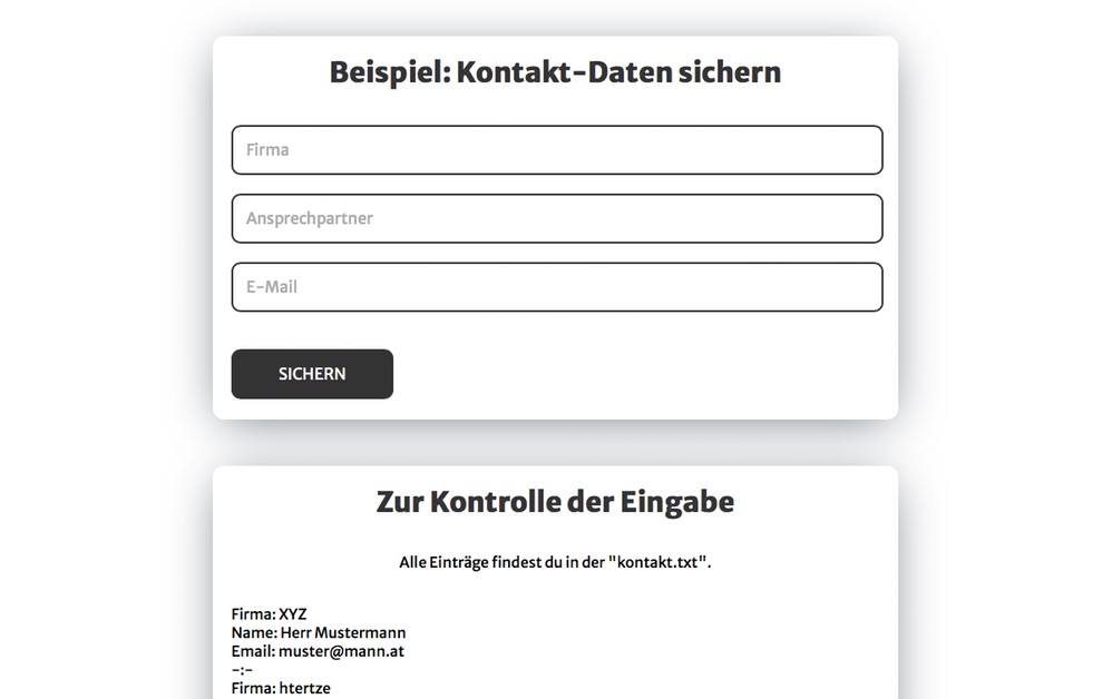 Ganz am Ende vor dem abschließenden body-Tag kommt der PHP-Code zum einlesen der Einträge. Die werden zwar in "kontakt.txt" gesichert, aber wir wollen ja sehen, wie das ausschaut. Speziell der Bereich "echo ..." ist für die zeilenweise Ausgabe verantwortlich.